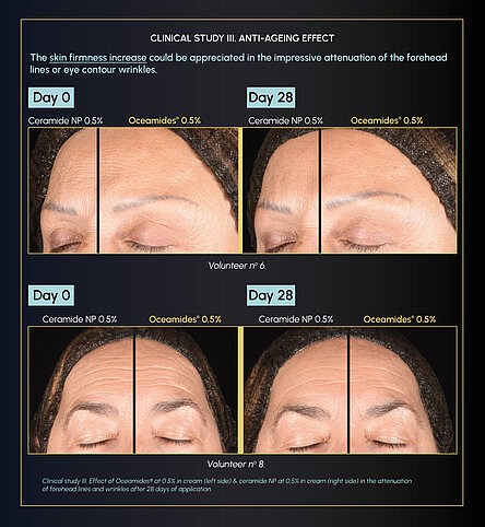 Studie III: Nach 28 Tagen bewies Oceamides® eine vergleichbare Wirkung wie Ceramid NP zur Verbesserung der Hautfestigkeit und Reduktion von Hautermüdung.