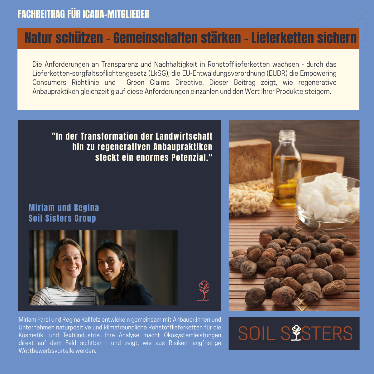 Die Chancen der Naturkosmetik - wie bodenaufbauende Anbaumethoden Biodiversität fördern, wie Lieferkettentransparenz Unternehmen entlastet und warum der Wert von Produkten dadurch steigt - das zeigen die Soil Sisters in ihrem Vortrag am 22.4.2026 beim ICADA Online-Fachtag Naturkosmetik kompakt:
